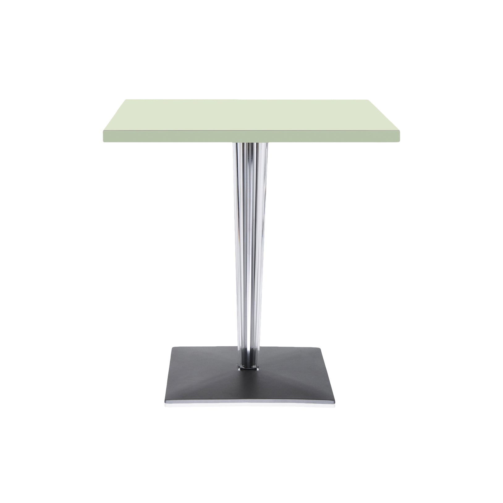 The TopTop tables come in a version created specifically for office use, shock resistant and weatherproof. The transparent circular or square section legs have a faceted surface, metal core and melamine top and are available in different colors, white, black, aluminum and green, and the base is painted aluminum.
