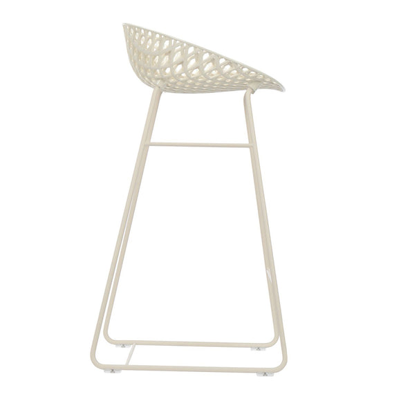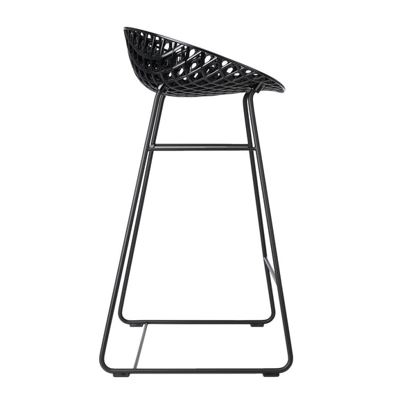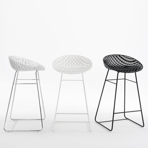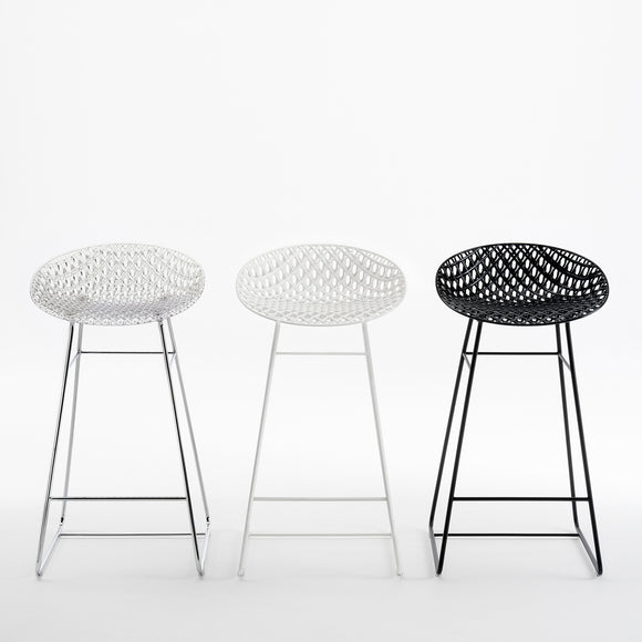 The brand-new stool joins the family of seats created by Tokujin Yoshioka and is crafted using a mold which enables the recreation of a 3D net that overlaps and crosses over. Thanks to a special injection technology, the layers of transparent or mass-dyed polycarbonate create a structure molded in a single piece, which simulates a metallic net, with a painted or chrome-plated structure, painted with stainless steel for the outdoor version.