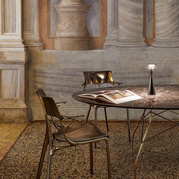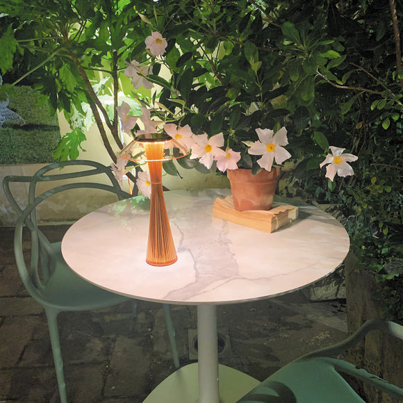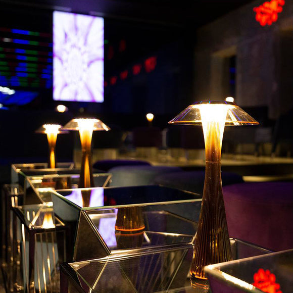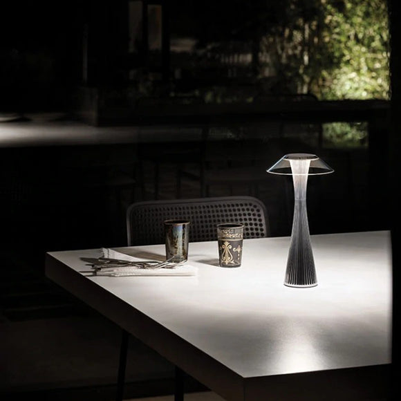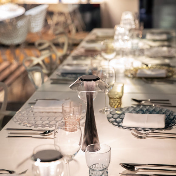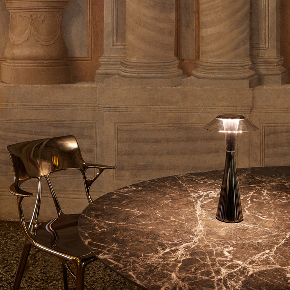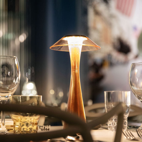 The Space Table Lamp with an elongated shape: the silhouette recalls the shapes of the Space Needle, the tower that made the Seattle skyline famous.