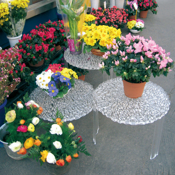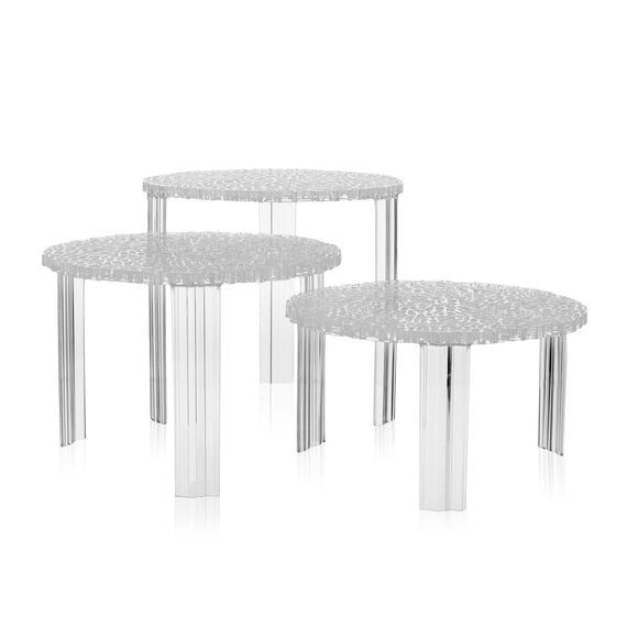 This line of tables originated from the creativity of Patricia Urquiola combined with Kartell's capability and technological know-how. They resulted from the research into innovative surfaces to achieve new visual and tactile effects. The surface of the T-table top alternates fullness and space to create an elegant and precious effect which is reminiscent of embroidery. This object expresses very poetic, feminine and extreme elegance born from technological research and experimentation. It's available in transparent and matte and comes in three different heights.
