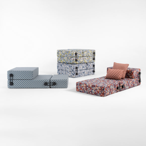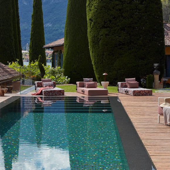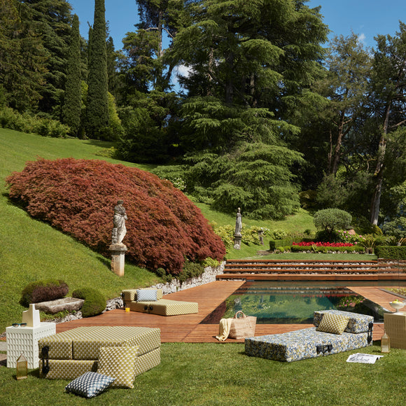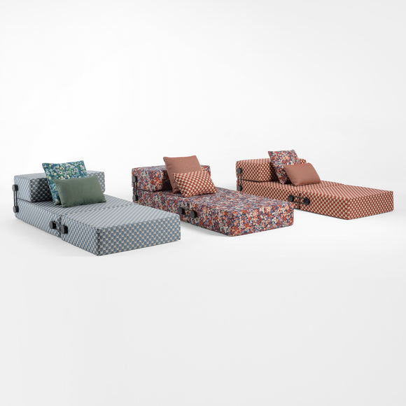 Indulge in the luxurious versatility of the Trix Outdoor Liberty Chaise Lounge. With its innovative design of three cushions linked by elegant rubber bands, it can be transformed into a double ottoman, a cozy bed, a comfortable lounge chair, or a welcoming armchair. Wrapped in your choice of weather-proof fabrics, this piece is a unique addition to any outdoor setting.
