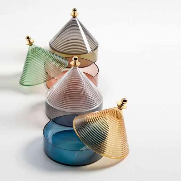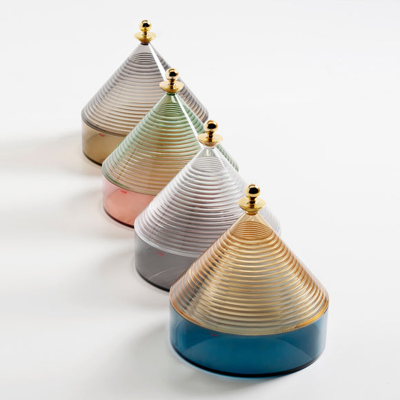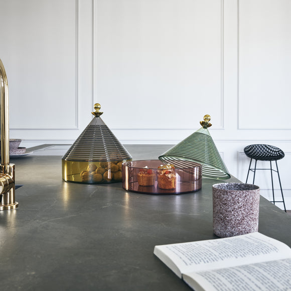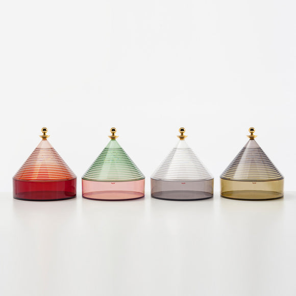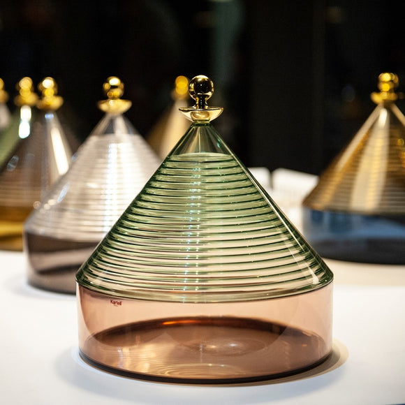 Inspired by the architecture of the typical houses of Alberobello in Apulia, Italy, the Trullo Table Container from Kartell is a sleek and stylish storage design ready to show off all of your precious objects. Crafted from transparent, mass-dyed or metallic thermoplastic technopolymer, this container makes a great housewarming or hostess gift or display piece on an entryway console table, vanity, or open living room shelf.