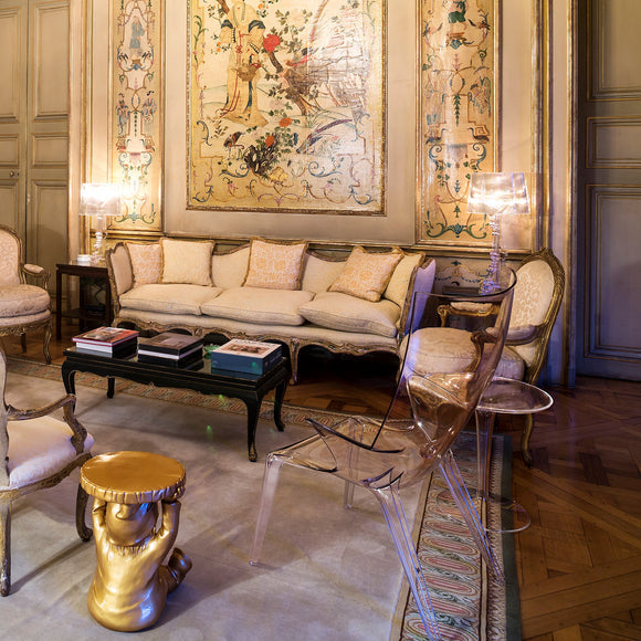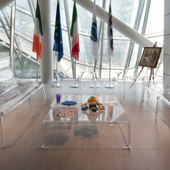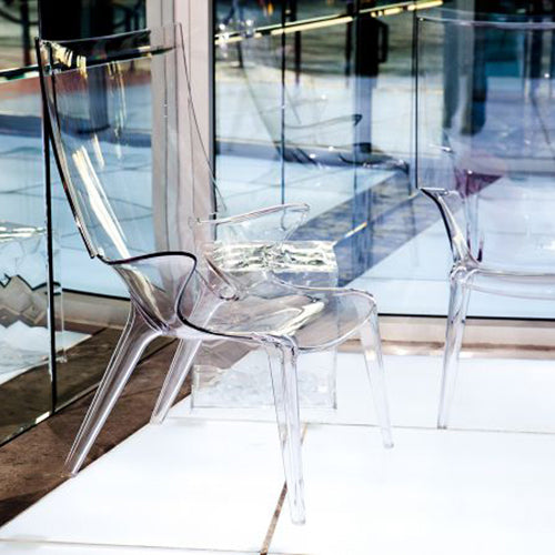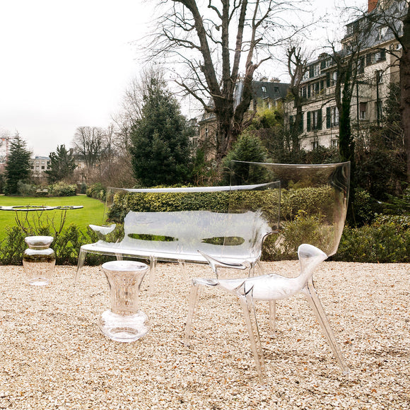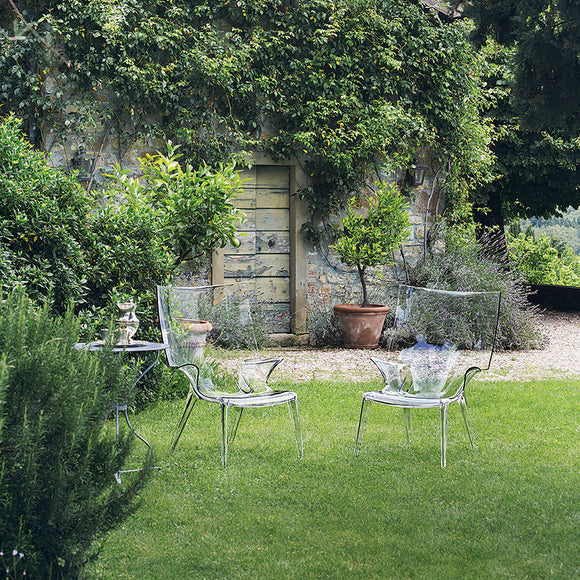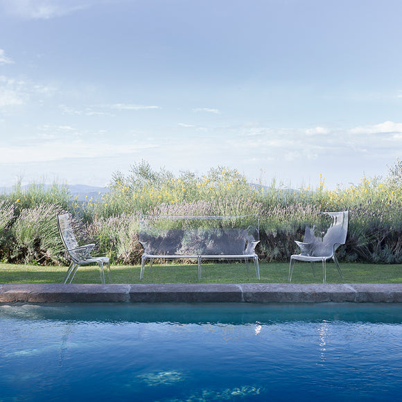 The Uncle Jim Armchair designed by Philippe Starck for Kartell is as transparent as they come. Constructed of polycarbonate, this armchair is the ideal addition to any modern outdoor space or as an indoor dining chair. With its wide frame open-style design, the Uncle Jim armchair offers space to relax. Pair with the Uncle Jack sofa for a trendy outdoor vignette sure to dazzle even the most discerning of guests.
