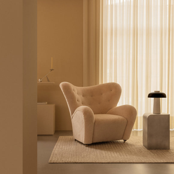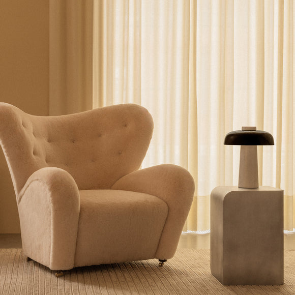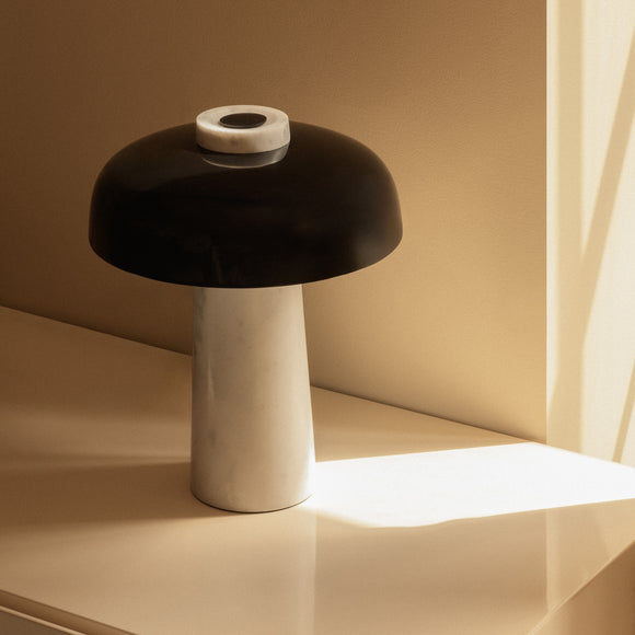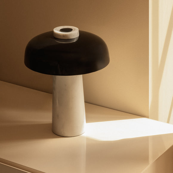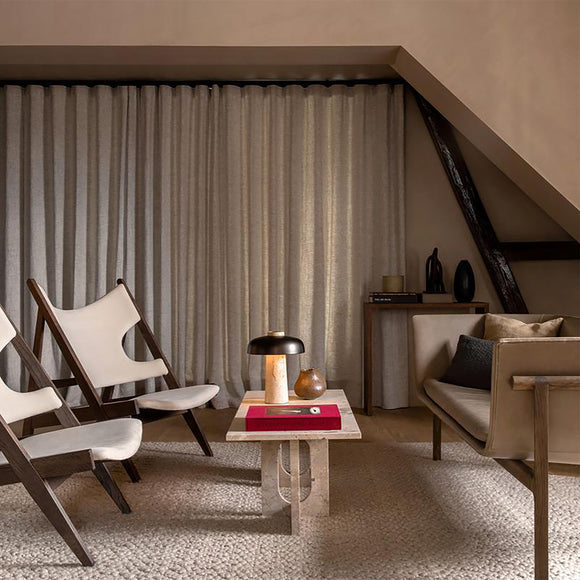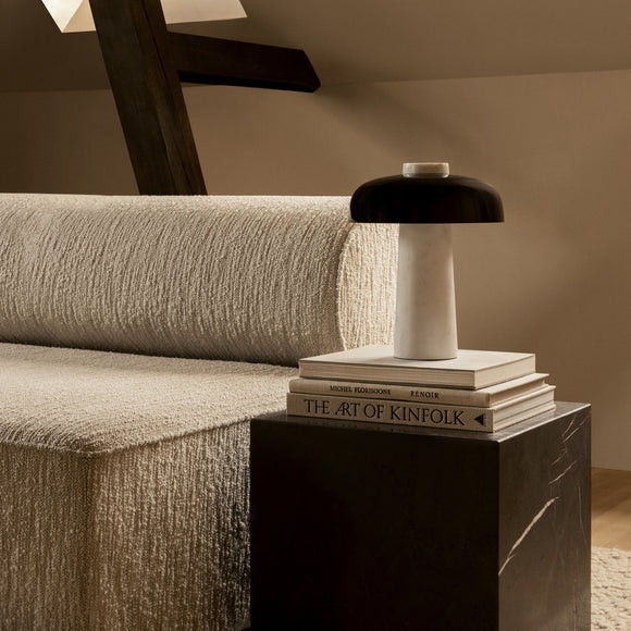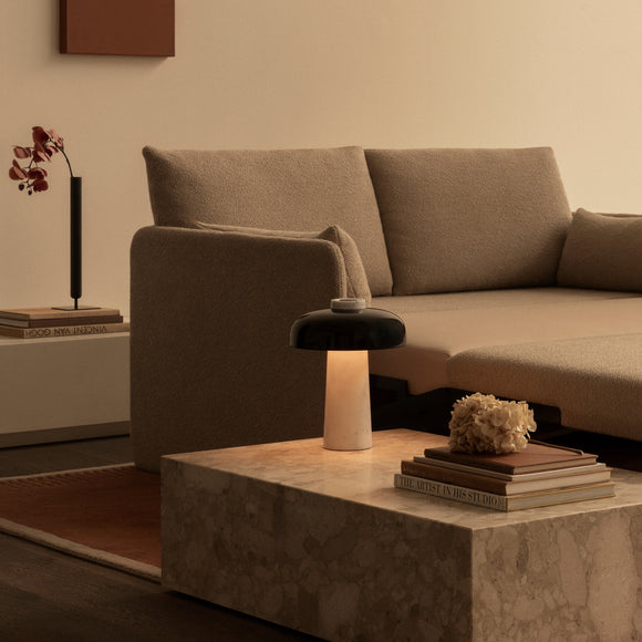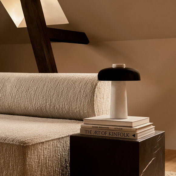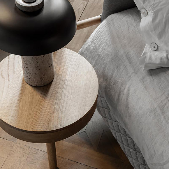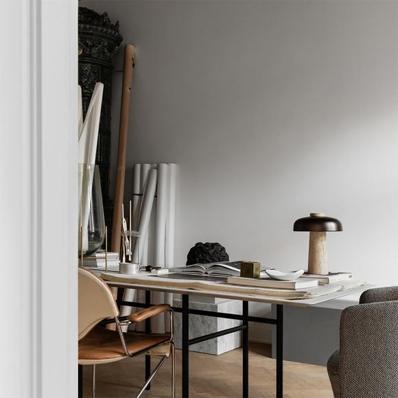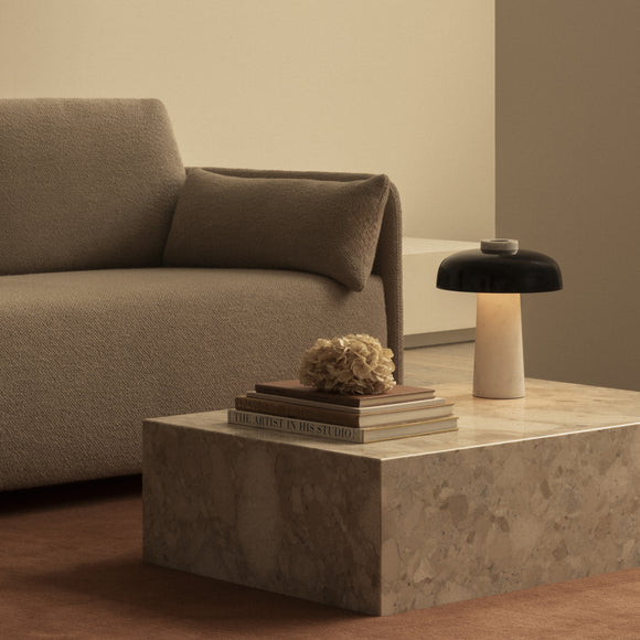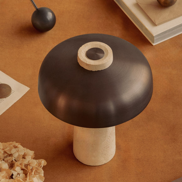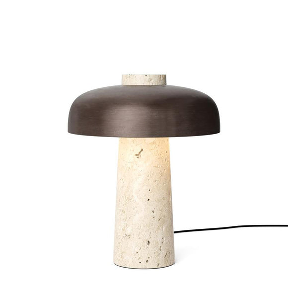 Experience the timeless elegance of natural materials with the Reverse Table Lamp by Audo Copenhagen. Inspired by 1970s Italian marble tables, this lamp balances a conical travertine base with a curved bronzed aluminum shade for a perfectly structured design. Enjoy the evenly diffused light that highlights the natural imperfections of the unworked stone, adding depth and intrigue to any space.