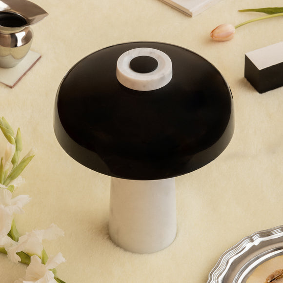 A dimmer switch fitted on top of the lamp controls the dim to warm LED light