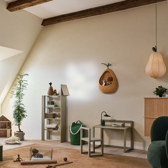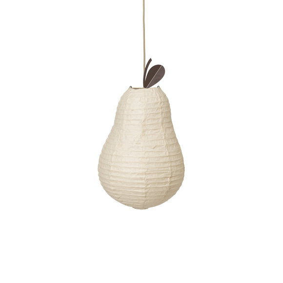 A charming and whimsical addition to any child's room, the Pear Pendant Light from Ferm Living is a captivating lighting solution. This beautiful lampshade is expertly crafted from richly textured Washi paper and playfully fashioned in the shape of a pear. A distinctive metal leaf adds a final touch of character to the design. Perfect for reading bedtime stories or as a comforting nightlight, it emits a soft, diffused glow that creates a cozy and inviting atmosphere for children and parents alike.