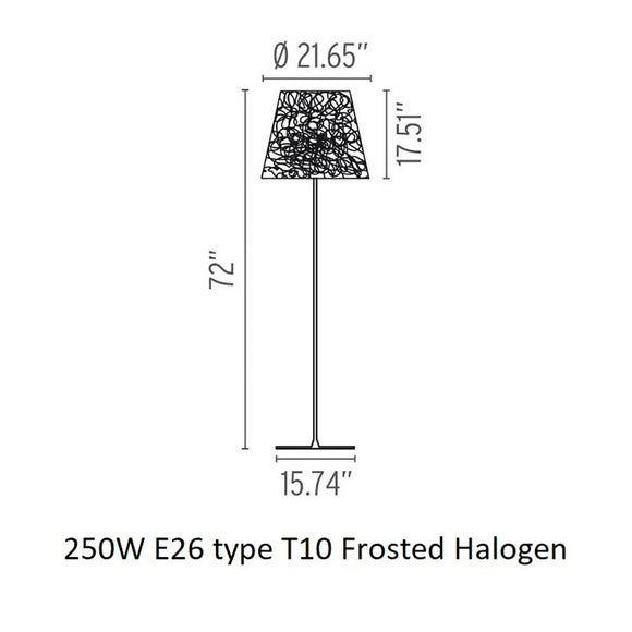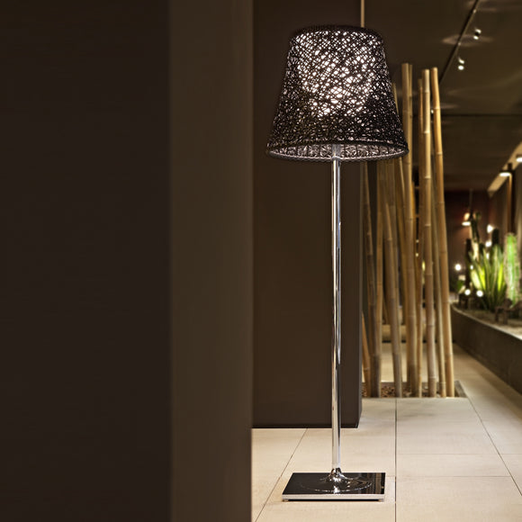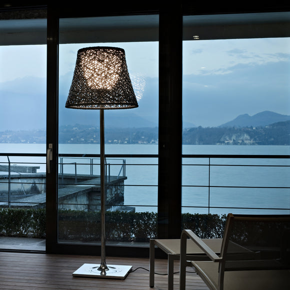 A member of the KTribe family of products, the KTribe F3 floor lamp provides diffused light specifically for outdoor use. The base and stem support are die-cast aluminum, and its structural parts are galvanized to protect against atmospheric agents. The inner diffuser and bulb holder are injection-molded PC (polycarbonate). The outer diffuser is made from braided, colored PVC tubes, and the inner frame is made of polyester painted, phosphor-chromed aluminum bars. The steel counterweight is cataphoresis treated for effective protection against atmospheric agents. The outer diffuser cover is phosphor-chromed die-cast aluminum. Available in Green Wall and Panama. Water Resistant IP55.
