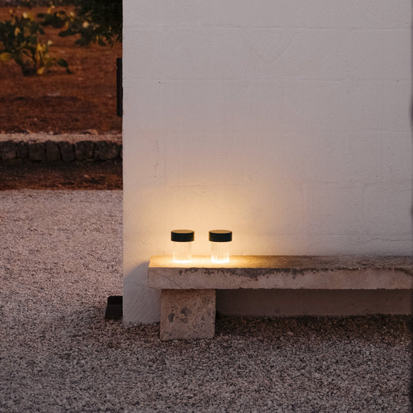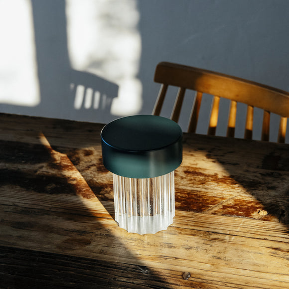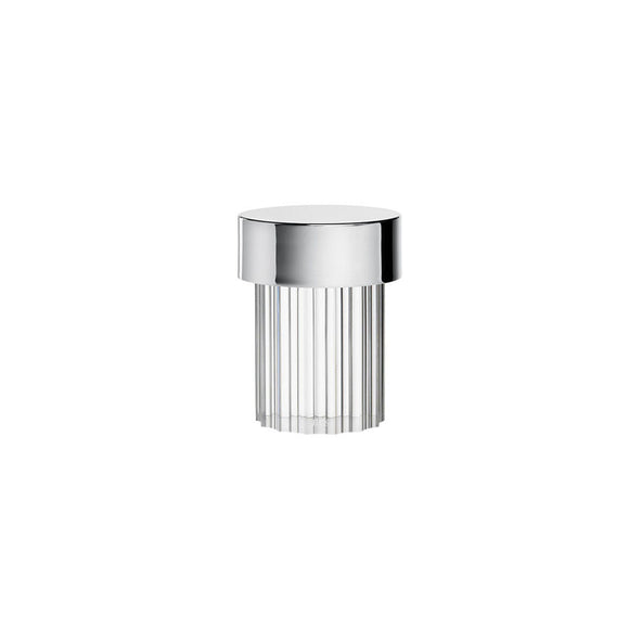 Flos Last Order table lamp was designed by M. Anastassiades. It is a rechargeable table lamp that diffuses light through a transparent solid glass base whose shape makes reference to architectural typology of the ancient column. The top cover comes in a combination of different metal and color finishes.