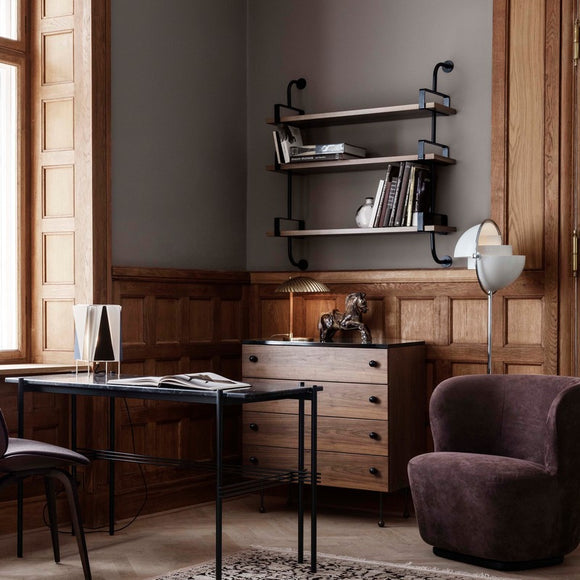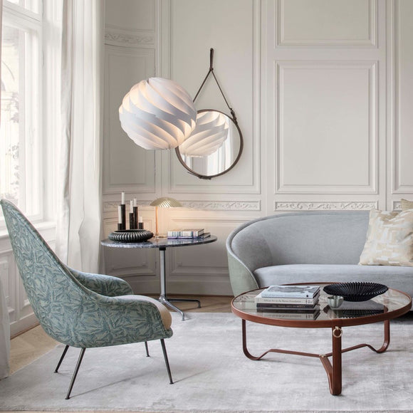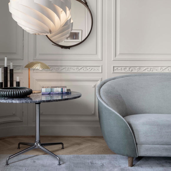 Illuminate your space with the timeless beauty of the Tynell 5321 Table Lamp from GUBI, designed by renowned Finnish designer Paavo Tynell. With a delicate and nature-inspired metal shade, this playful and functional piece adds a charming touch to any room. Embrace the honed aesthetic and experience the warm. welcoming light as it dances through the linear indentations, creating beautiful shadows.
