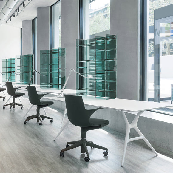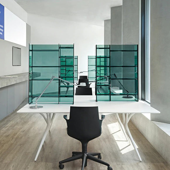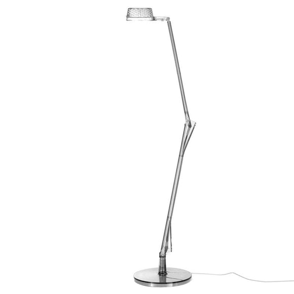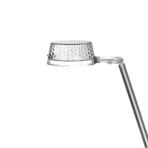 Aledin is a LED task lamp available in two different versions, Tec and Dec, whose distinctive element is the diffuser. Aledin Tec has a flat head which throws a direct luminous beam and is also adjustable thanks to the movement of the diffuser itself. These characteristics make it suitable for office use while Dec, on the other hand, is defined by the faceted decoration of its cone-shaped diffuser. On this model, the luminous beam throws a wider and more atmospheric light which well lends itself to residential applications. The two articulating arms in polycarbonate, which constitute the structure of both models, are characterized by two aluminum rods endowed with a conductivity function. In class 3, this lighting fixture has a high-performing luminosity in the area of 600 lm and enables considerable savings in energy consumption thanks to its latest generation 4.2W or 5.6 W LED lamp bulbs.