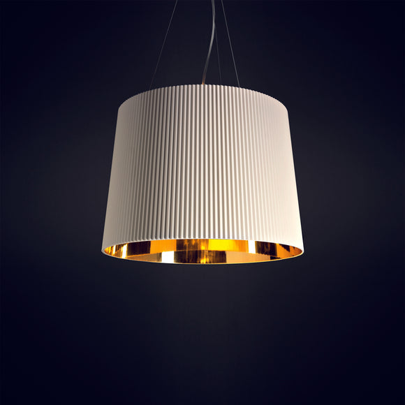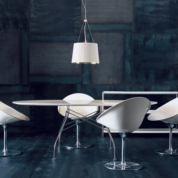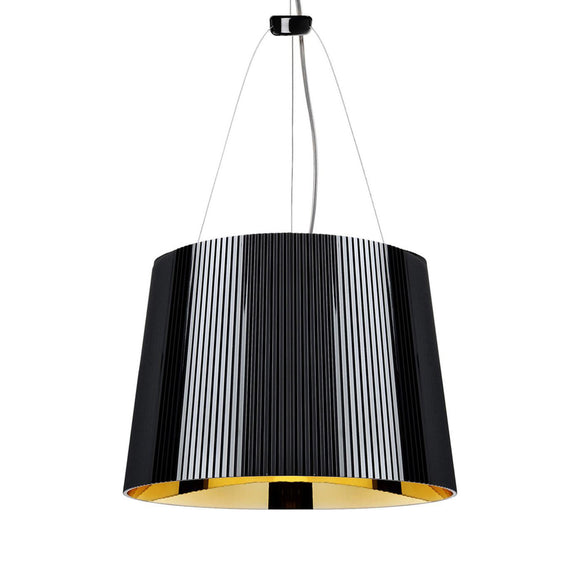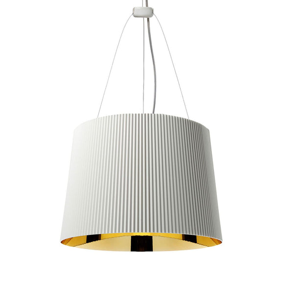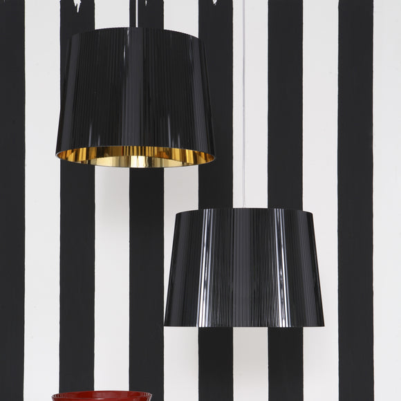 Gè is a suspension lamp fixed to the ceiling with a decorated polycarbonate rosette, whose shape brings to mind antique Venetian chandeliers. It is composed of a lampshade of 141/2 inches in diameter, whose surface is processed into a plissé effect. Made entirely in polycarbonate, Gè is available in two versions. The first comes from the effect of transparency and of its soft, sophisticated colors. The second comes from the effect of white and black combined with gold and with the chrome version. The cable is adjustable in length between 18 and 92 inches.