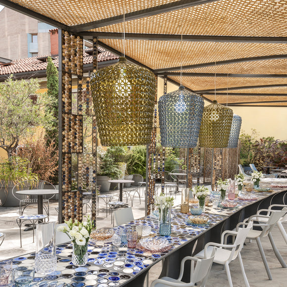 The Kabuki Pendant is injection molded. The sophisticated injection technology used makes it possible to create a woven structure similar to lace with a unique perforated surface through which the light is diffused.