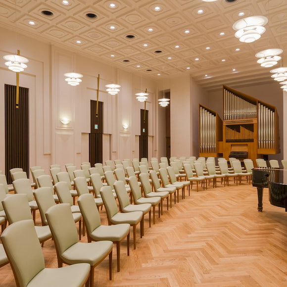 Poul Henningsen designed the three-shade system during 1925/1926. The first lights using the system were designed for an exhibition in Paris. His work with Louis Poulsen continued until his death in 1967. Throughout his life, PH sought to create glare-free lighting; aiming to direct light where it was most needed, and creating soft shadows while using incandescent bulbs as a light source. The four-shade system was launched in 1931 to create a fixture that could be mounted high up and serve as an alternative to the commonly used chandeliers. The PH four-shade fixture was designed to increase the amount of light emitted horizontally to provide greater illumination of walls and shelves than was possible using standard three-shade lights. It was removed from the Louis Poulsen standard range in the 1940s, but was redesigned in 1979 by Danish architects, Sophus Frandsen and Ebbe Christensen, for the Charlottenborg exhibition building in Copenhagen. To resolve the never ending glare problem, the two architects decided to add a small blue shade to the design. They also included a new surface with a more mattee, white painted shade, to achieve a more even, comfortable light, ideal for museums and exhibition rooms or as general lighting in rooms with high ceilings.