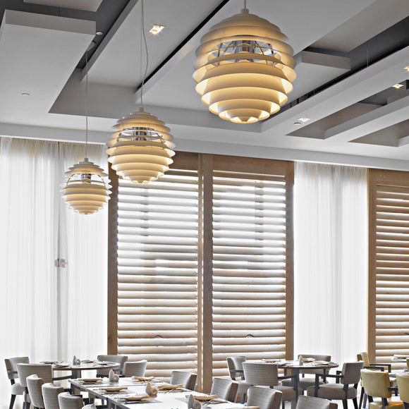 Poul Henningsen designed the three-shade system during 1925/1926. The first lights using the system were designed for an exhibition in Paris. His work with Louis Poulsen continued until his death in 1967. Throughout his life, PH sought to create glare-free lighting; aiming to direct light where it was most needed, and creating soft shadows while using incandescent bulbs as a light source. PH Louvre was designed for the Adventist Church in Skodsborg, Denmark, in 1957. The globe-shaped fixture is made up of 13 shades mounted on four supports. It is a simplification of the Spiral designed by Henningsen in 1942.
