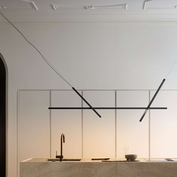 Across is a versatile and dynamic lamp, ready to personalize any space, “crossing” it with a clear, distinctive graphic gesture. A linear suspension lamp composed of three interconnected axes of two different sizes, to create compositions with different images and levels of complexity. The structure is formed by a horizontal extruded body that contains an optical group for direct lighting, and two hinged elements that make it possible to attach the lamp to the floor or the ceiling. The lamp’s adaptability gives rise to various configurations to respond to different technical and stylistic needs.