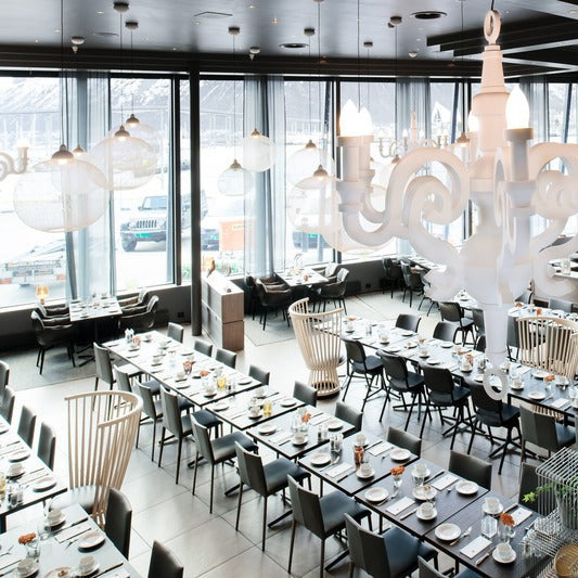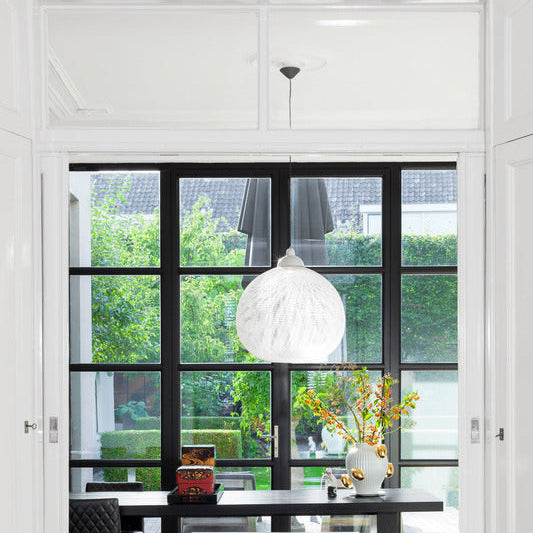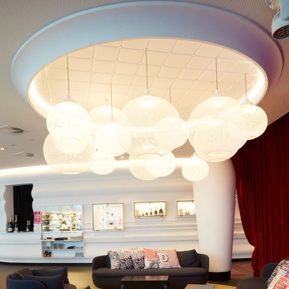 Add a touch of modern elegance to your space with the Non Random Suspended Lamp from Moooi. This eye-catching pendant light features a unique design inspired by symmetry of yarn balls and bubbles. The fiberglass shade and powder-coated aluminum cap provide a beautiful shine, while the lantern-like profile adds a sophisticated touch. Perfect for illuminating seating areas, foyers, or dining spaces, this pendant light is sure to infuse a stylish flair into any room.