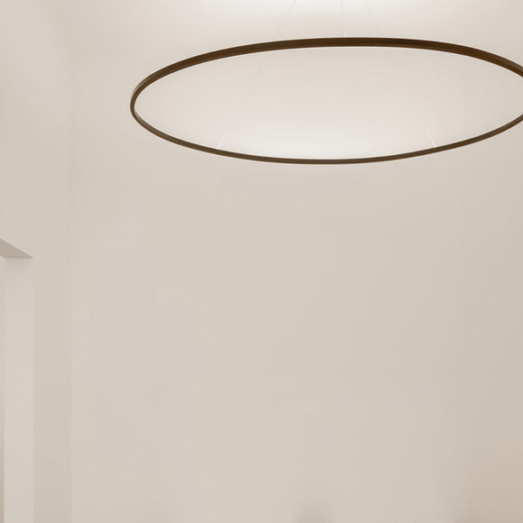 LED pendant lamp, available in five versions: major, minor, double, triple and mega. Widespread direct or indirect lighting. Extruded aluminum, painted in matte white or black, polished, or glossy gold anodized. Opaline diffuser. Ellisse is manufactured through a proprietary technology to combine the extruded bars (patent pending).