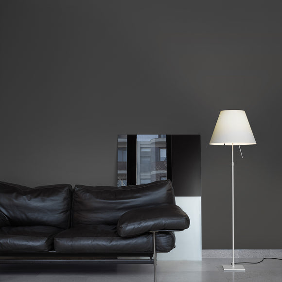 Tradition and innovation meet in this classic maxi floor model. The aluminum stem and polycarbonate lampshade enhance large spaces with lightness and luminosity for which this lamp is renowned.