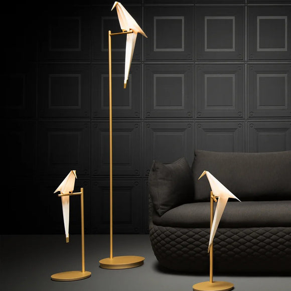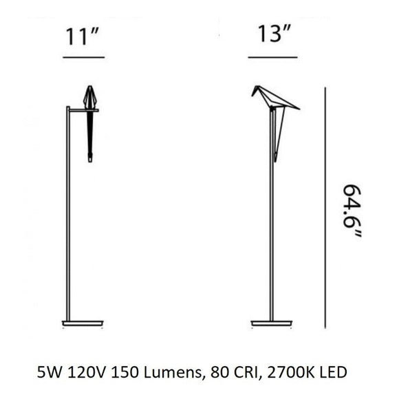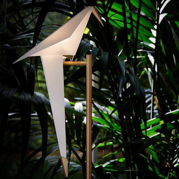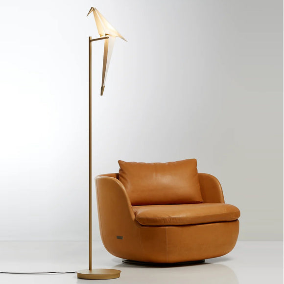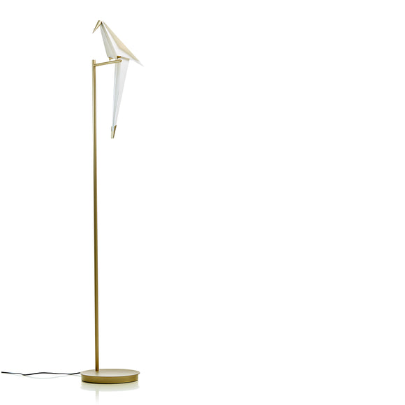 Welcome the quiet grace of nature into your home with the Perch Floor Lamp from Moooi. Designer Umut Yamac's innovative design combines the organic beauty with the intricacy of origami. Made from synthetic non-flammable paper and elegant brass accents, the bird is illuminated from within, giving off a soft glow, perfectly accenting any space. With a light touch, the bird will sway back and forth, adding lively movement to your favorite interior.