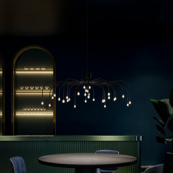 Introduce a celestial touch to your interior with the Starfall LED Chandelier from Moooi. Skillfully crafted, steel has been elegantly shaped into curved droplets with integrated LEDs at the end mimicking the journey of falling stars. Crafted by Swedish designers Sofia Lagerkvist and Anna Lindgren of Front Studio, this masterpiece radiates sophistication above a dining table, entryway, or sleek home office.