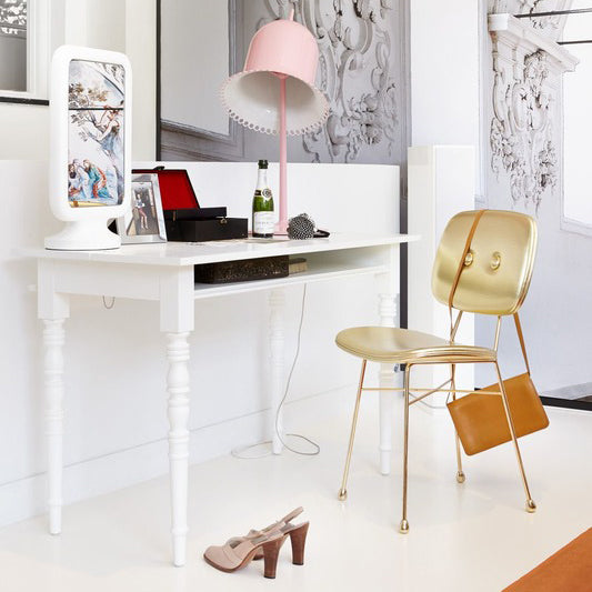 Bring a sleek touch to any interior with The Golden Chair from Mooi. Designed by Nika Zupanc, this upholstered take on the traditional school chair combines punk elegance with techno chic. The steel legs and rounded metal feet provide enduring style, while the comfortable upholstered seat and back offer luxurious comfort. Perfect as a standalone piece or as part of a set, this chair exudes lasting appeal.