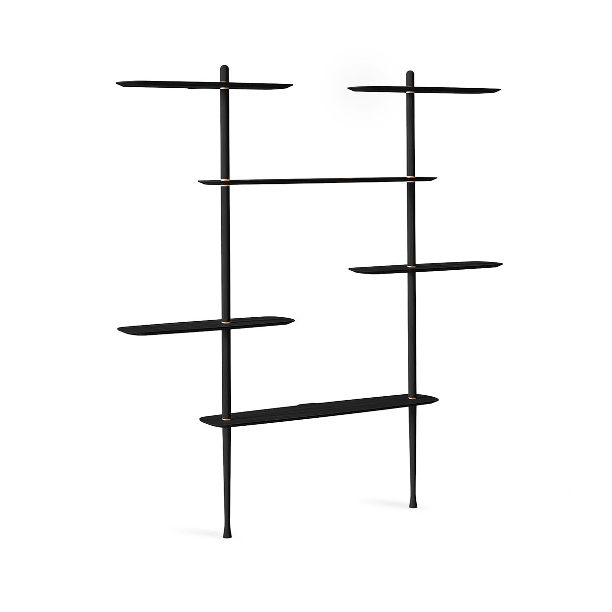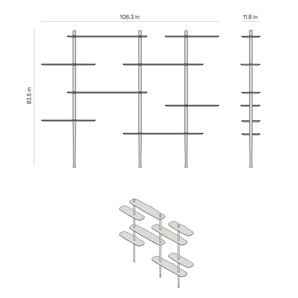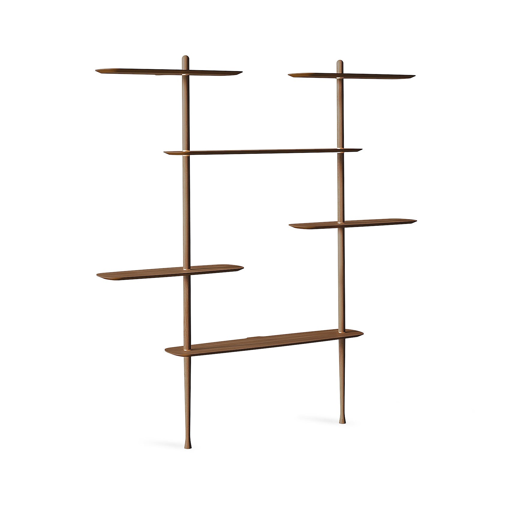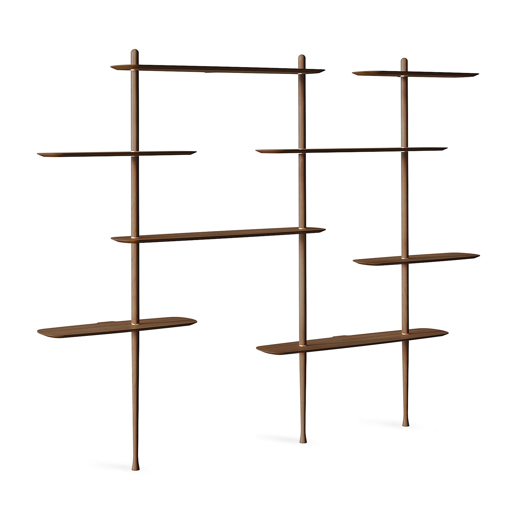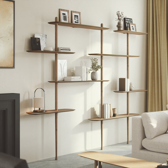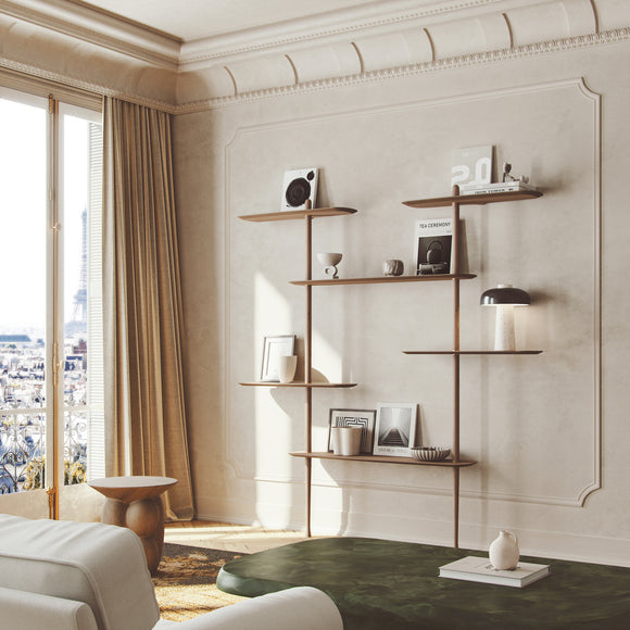 The Axis Shelving System from Nomon combines minimalist design with sculptural elegance for a customizable storage and display design. Handcrafted from solid walnut and natural walnut veneer, its modular components offer versatile configurations, allowing you to tailor the unit perfectly to your space while showcasing your favorite pictures, decor, and items from your travels.