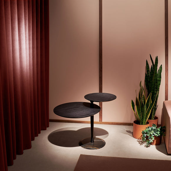 Attractive side table with a functional swivel top. Its subtle wood turning lathe holding the superior top creates a visual element with balance and lightness. The marble base contributes with prestige to the design.