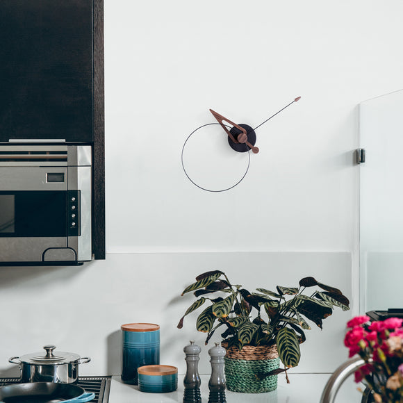 Bring functional visual appeal to your home, office, or commercial space with the eye-catching Pico Wall Clock from Nomon. With its abstract design and artful presence, this wall clock uses a small central disc to both secure the clock to the wall and conceal its mechanisms within. Showcasing hooped and pointed hands skillfully crafted from wood and fiberglass, this clock naturally draws the eye in and works as an exceptional conversation piece in a lounge or study. Handcrafted in Spain, this wall clock makes an excellent housewarming or holiday gift for the friend who has it all or the style obsessed time junkie.