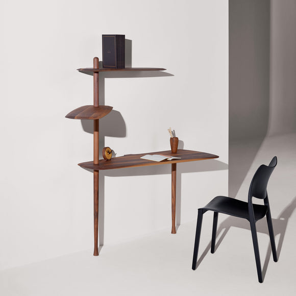 Desk in Solid Walnut with Two Selves and Pencil Pot. Combines one fixed and one freestanding shelf, which can rotate, providing additional functionality.