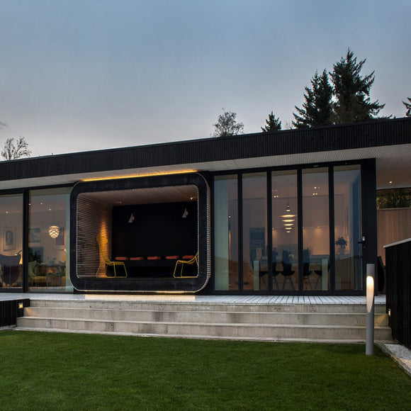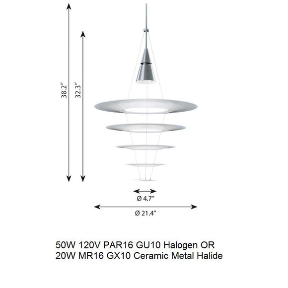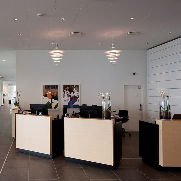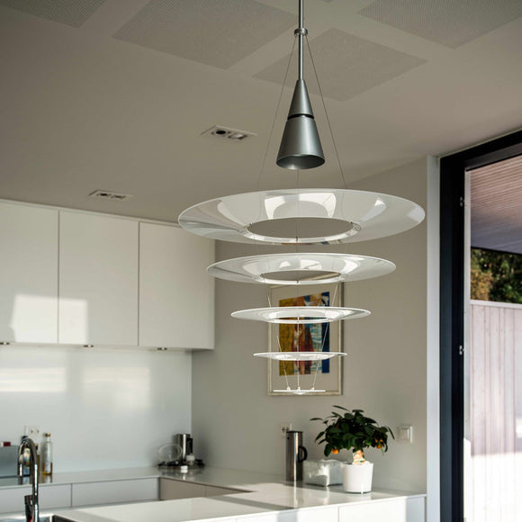 Enigma 545 was designed by Japanese designer Shoichi Uchiyama in 2007 and extends the Enigma family. Enigma 545 is a larger version of Enigma 425, based on the design idea of floating shades held by ultrathin wires, providing a transparent and light expression. The design fitted well with Louis Poulsens product philosophy, and was a new interpretation of the multi-shade system. Japanese grace combined with Scandinavian simplicity. An enigma is a mystery, referring to the fact that the shades appear to hover suspended when viewed illuminated from a distance.