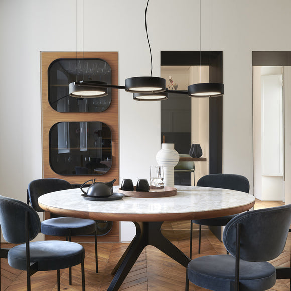 Add a touch of refined elegance to your space with the Berlin Pendant Light. The metal ring diffusers enclose decorative wired glass discs and can be rotated 360° to suit your lighting needs. Available in anodized brass and matte black, this versatile light is perfect for highlighting a dining room table or accenting a kitchen island countertop.