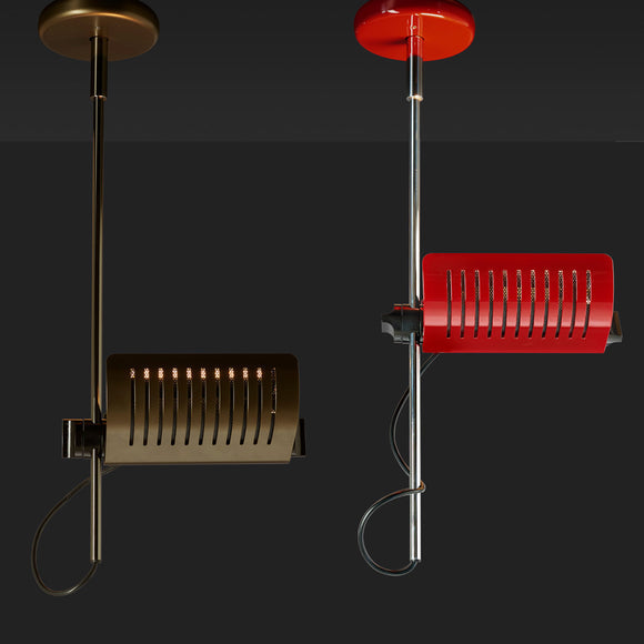 One of the first domestic designs to use the halogen bulb, the Colombo Pendant Light from Oluce offers clean-lined style and technological functionality for a well-lit interior. Originally designed by Joe Colombo in 1970, this pendant light showcases a lacquered ceiling fixture, with a chromium-plated stem and adjustable reflector in aluminum. Equal parts industrial and contemporary, this pendant is ready to provide both direct and indirect light for a fabulous kitchen island lighting choice, or utilize as an accent in your at-home office space for a well-lit work routine.