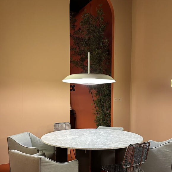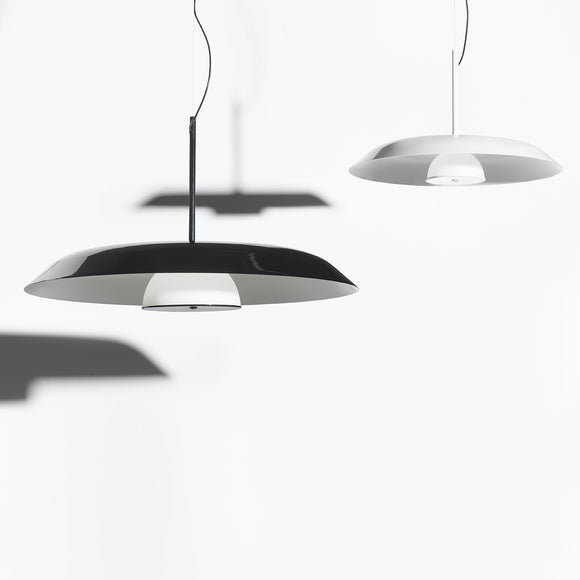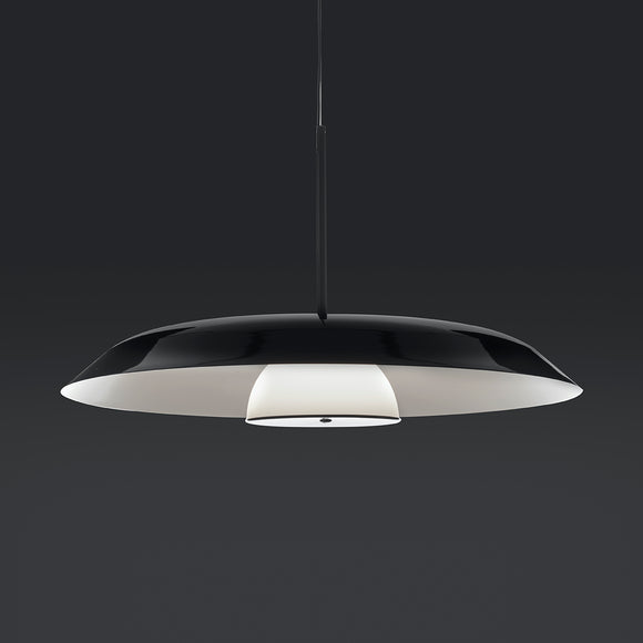 Experience a warm and cozy centerpiece with the ambient light of the Iride Pendant Light from Oluce. Its low-profile silhouette and contemporary design add a touch of elegance to any space. The central diffuser, made of opaline blown glass, provides a smooth and even diffusion of light for a comfortable ambiance in a dining space or entryway.