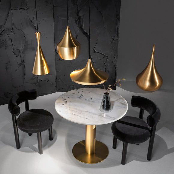 Inspired by the sculptural simplicity of brass cooking pots and traditional water vessels on the subcontinent. This pendant light is spun and hand-beaten by renowned skilled craftsmen of Moradabad in Northern India. Beat Wide LED Pendant Light is made from brass and is offered in four finishes. Choose from the original patinated black exterior, gloss white, or brushed brass with brass interiors or the new mattee grey with silver-plated interior. The Beat collection is one of Tom Dixon's widely recognized collections and also includes Stout, Tall and Fat pendants. Create dramatic statements by hanging multiples with the different shapes. Beat Wide LED Pendant Light provides direct ambient illumination. This versatile pendant can be used in residential and commercial applications.