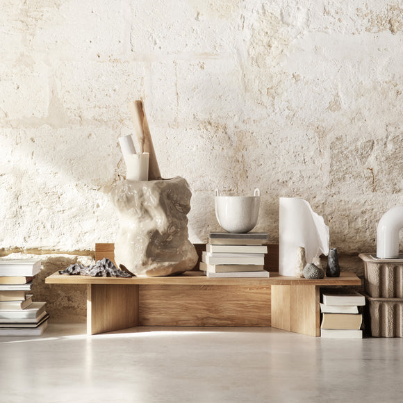 Fusing Japanese woodworking techniques with Scandinavian design sensibilities, the simple and sculptural Oblique Bench is made with low living in mind. Taking its name from the tilted angles of the few, yet perfectly placed, elements that make up its construction, this solid oak seat with a black oiled finish elevates objects when used as a display for books, vases and more, and makes light work of putting on and taking off shoes in a hallway.