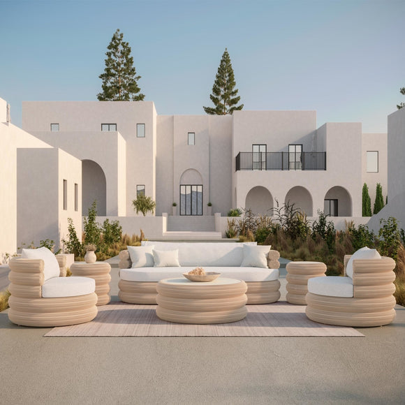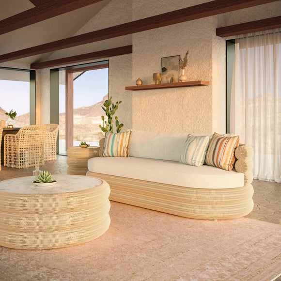 Experience luxury and comfort with the Texoma outdoor 3-seat sofa by Azzurro Living. This high-end sofa is made with all-weather wicker in a sophisticated almond color, ensuring it can withstand any weather conditions. The intricate textures and clean lines of the sofa create a classically glamorous and modern silhouette, balancing old and new in a swoon-worthy design. The sofa is impeccably crafted and perfectly proportioned, providing maximum comfort and style. The luxurious chenille outdoor performance fabric adds to the sofa's comfort and durability, making it a perfect addition to any outdoor living space. Upgrade your outdoor furniture with the Texoma 3-seat sofa by Azzurro Living.