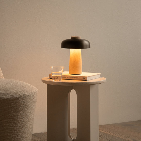 The portable iteration of the Reverse Table Lamp masterfully combines raw and refined elements, drawing inspiration from the structural play of geometric constraints. The conical base is made from untreated stone, with natural imperfections that highlight its organic beauty. The base is complemented by a curved, bronzed aluminium shade with a smooth, polished finish, creating a striking contrast of textures. An opal diffuser provides soft, even light, ideal for creating a warm atmosphere in any setting. With a dimmer switch adjustable to three brightness settings, the lamp offers flexibility for different lighting needs. IP44- approved, it is suitable for use in wet rooms and outdoor spaces. To ensure longevity, it should be stored indoors when not in use. This rechargeable lamp can also be used with the Audo Charging Board. However, due to the size of the lampshade, not all ports on the board can be occupied simultaneously.