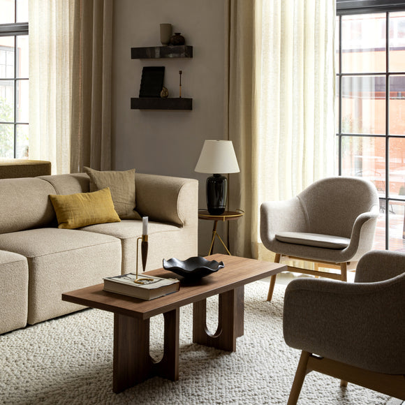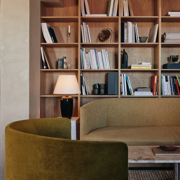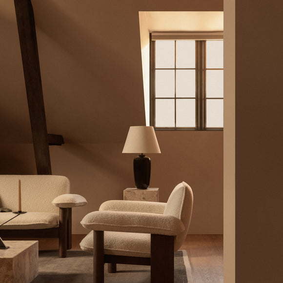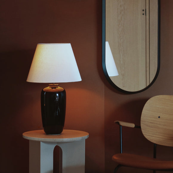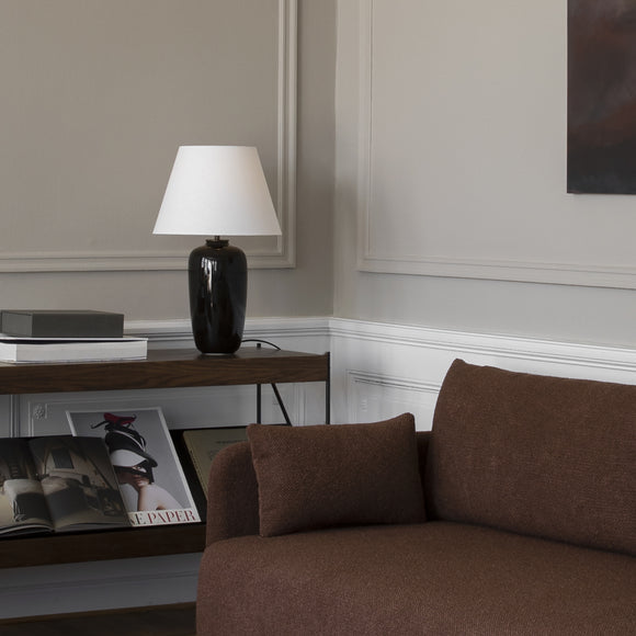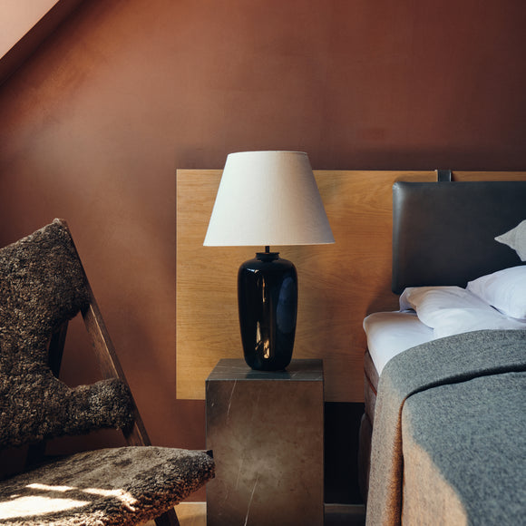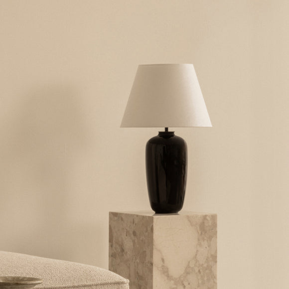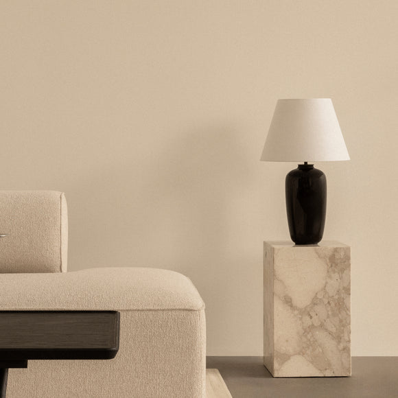 Transform any space with the welcoming ambiance of the Torso Tall LED Table Lamp from Audo Copenhagen. The elongated base, made of black-glazed stoneware, adds a sculptural touch while the linen shade and brass touch dimmer create instant ambience. Its timeless design makes it perfect for any setting, create softly diffused light for visual warmth.