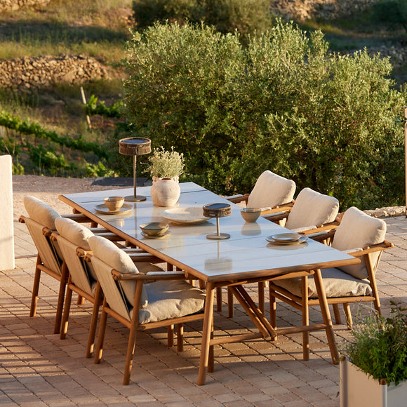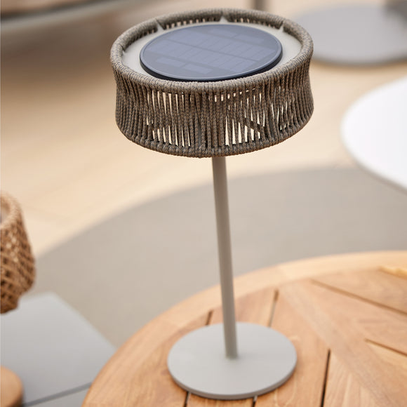 Elevate your evenings spent outdoors with the charming Illusion Indoor/Outdoor Table Lamp from Cane-line Design. Combining aesthetics and practicality, this solar-charged LED lamp provides a warm and inviting glow while embracing sustainability. Its timeless charm and delicate appearance add elegance to any outdoor space, the woven rope shade providing a unique touch of texture to any patio or living room.