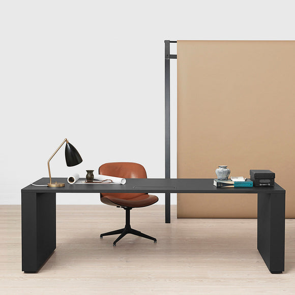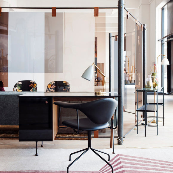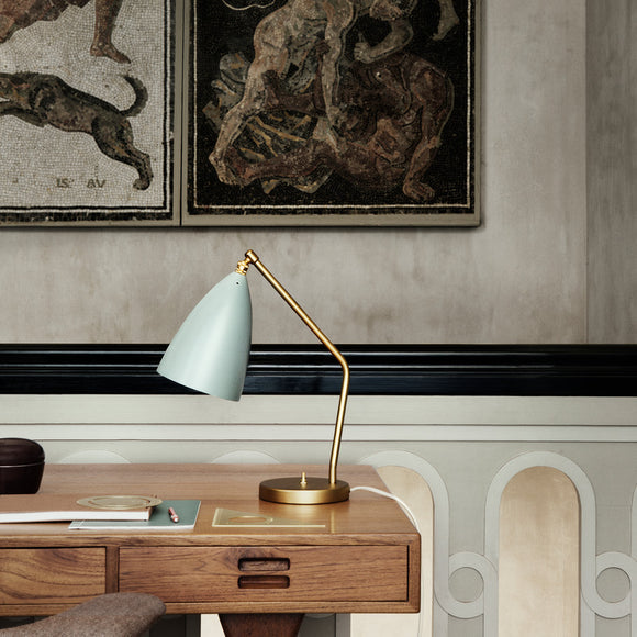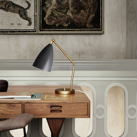 Perfect for a sophisticated office space or bedside table, the Grashoppa Table Lamp from Gubi brings iconic, mid-century modern form to your home. Designed by Swedish architect Greta Grossman, this lamp combines European craftsmanship with a playful West Coast aesthetic. The solid-brass frame and adjustable conical shade provide focused lighting while adding a touch of sophistication to any room.
