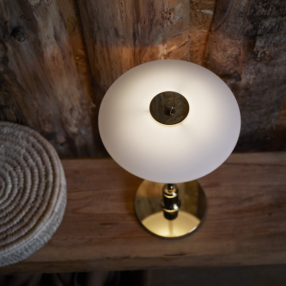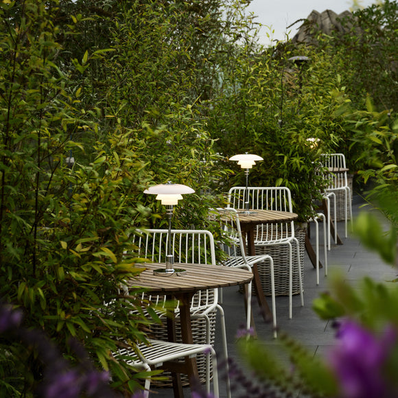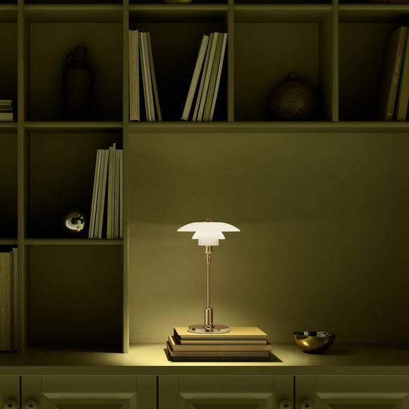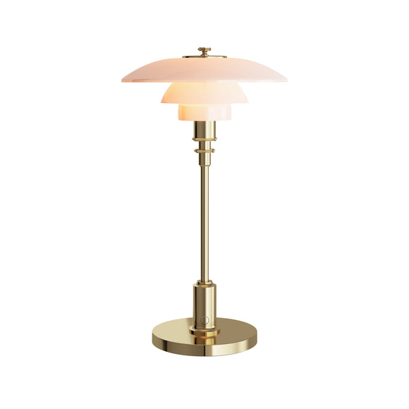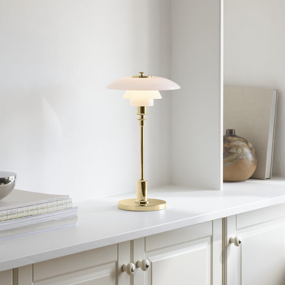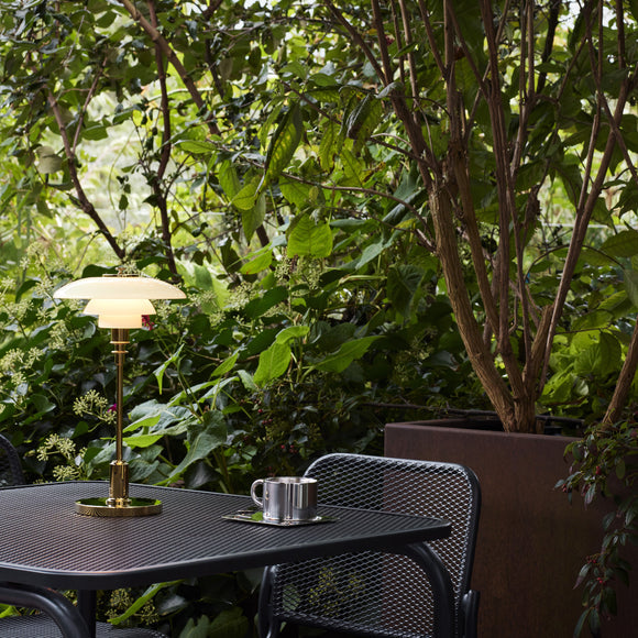 Illuminate your space with the sophisticated elegance of the PH 2/1 Portable Table Lamp from Louis Poulsen. Designed by Poul Henningsen, the intricate glass shade is finely crafted to create an instantly recognizable, tiered silhouette. Crafted with a brass frame and balanced, circular baseplate, this lamp is not only stylish but portable for all of your lighting needs. With vibrant LED lighting and glare-free horizontal light emission, this lamp is perfect for any space.