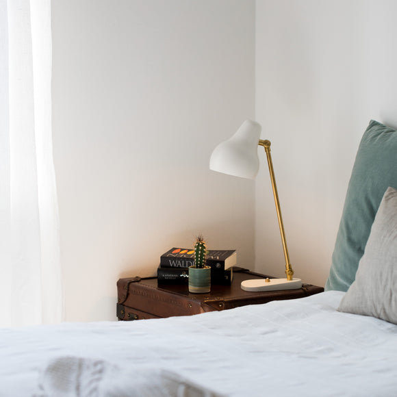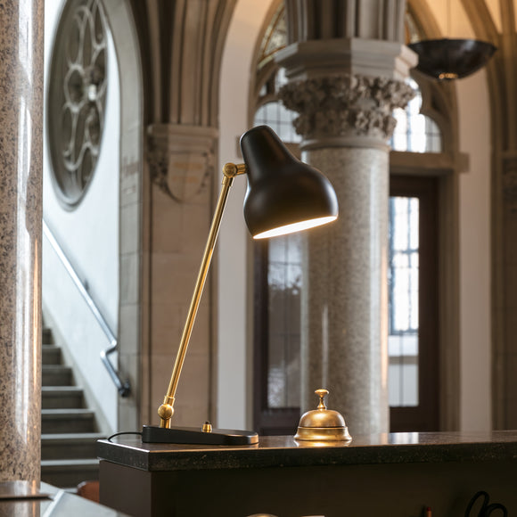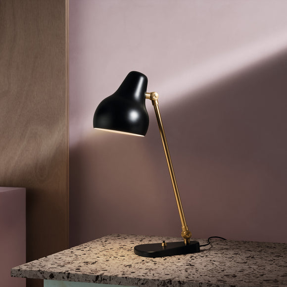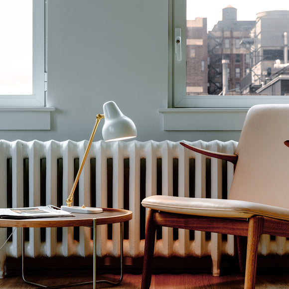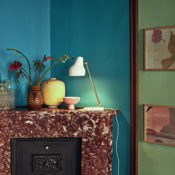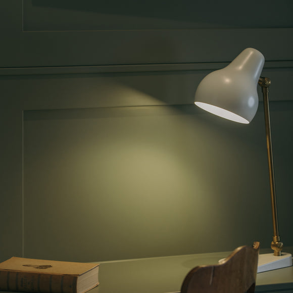 The VL38 family is born of functionalism. The light head is organically shaped, painted white and obliquely angled. The light arm, which is made of brass, features a small hinge on top to allow minute adjustment of the light head. The luminaire provides accurate downward light, making it ideal for use as a work light or as more general illumination.