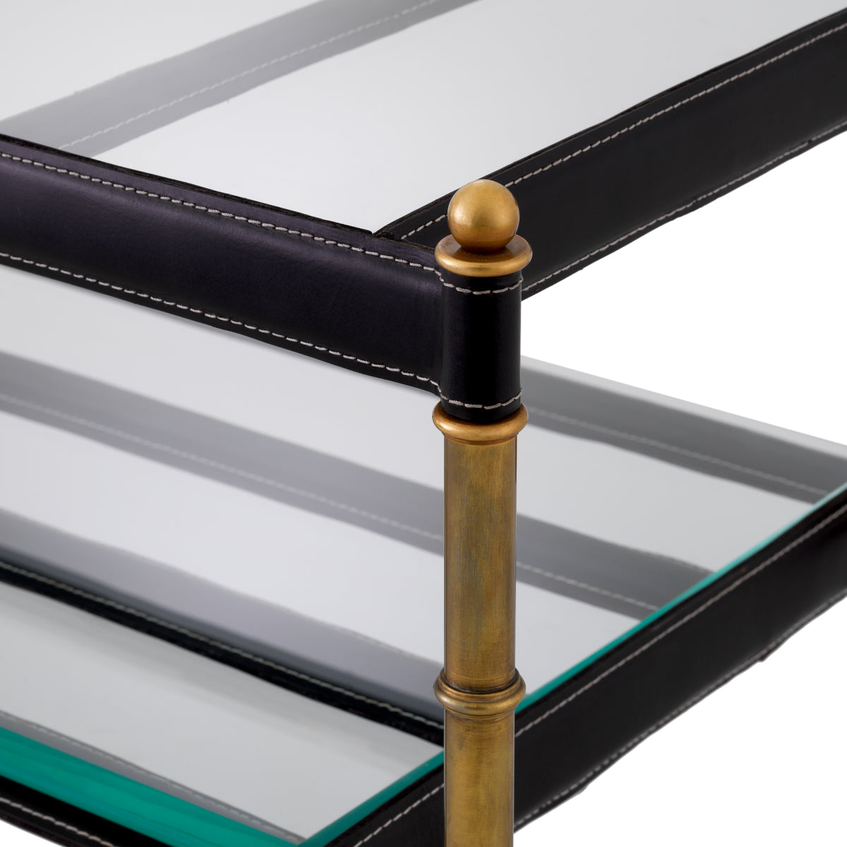 It has four slender legs with finials in a vintage brass finish and a top and lower shelf of bevelled clear glass. Leather straps lend this rectangular coffee table equestrian appeal.L. 95 | W. 42 | H. 46 cm