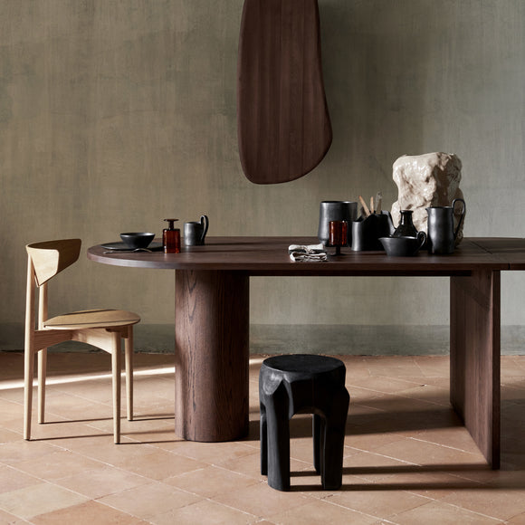 A true work of art, the Pylo Dining Table from Ferm Living features a unique silhouette and sculptural expression for a timeless aesthetic. Boasting an eye-catching blend of shapes and sustainably-sourced wood construction, the foldable leaf adds versatility, conveniently accommodating two extra guests for special occasions.