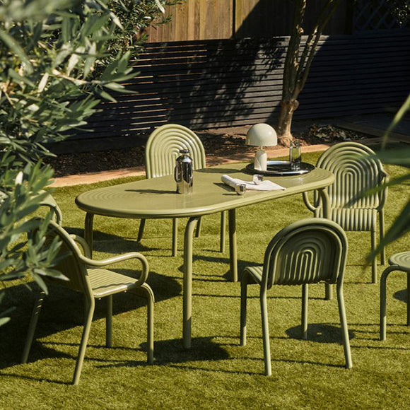Elevate your outdoor space with the Groove Obround Dining Table from Tom Dixon. Inspired by art deco design, its raised ridges add a touch of sophistication and visual appeal. Crafted from premium aluminum with a powder-coated finish, this table is both durable and environmentally friendly. Enjoy luxurious outdoor dining with this elegant piece.