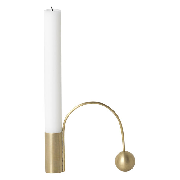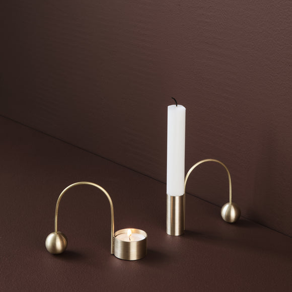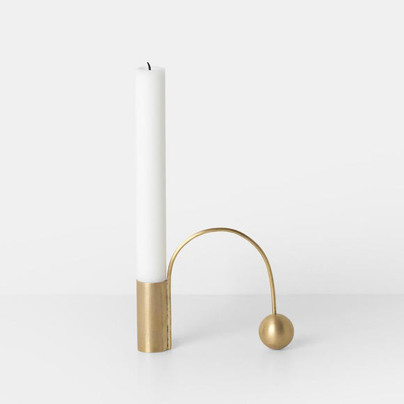 This candle holder displays an exercise in mastering the art of balance with each part counterweighing the other to reach a moment of tranquil stillness. The geometrical shapes are both sculptural and functional elements, as the arch may be used as a handle to carry the candle holder.