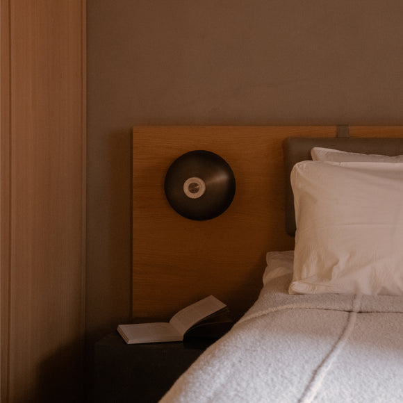 The Reverse Wall Lamp is inspired by both the tension and harmony created by geometric constraints. The lamp’s wall mount is crafted from untreated travertine stone, shaped into a conical form with natural imperfections that celebrate the beauty of organic textures. In contrast, the curved shade is made from anodised bronzed aluminium with a smooth finish for a polished touch. The lamp features an opal diffuser for even light diffusion and a warm, ambient glow. For retail use, the lamp features an intuitive dimmer, allowing seamless brightness control, with a switch-free cord for a clean aesthetic.The contract version is tailored for commercial spaces, with a rotary dimmer on the cord for easy access and a decorative, non-functional top button. It too supports hardwired installation, ideal for hotels, offices and public spaces. Both versions can be hardwired for a more seamless installation.
