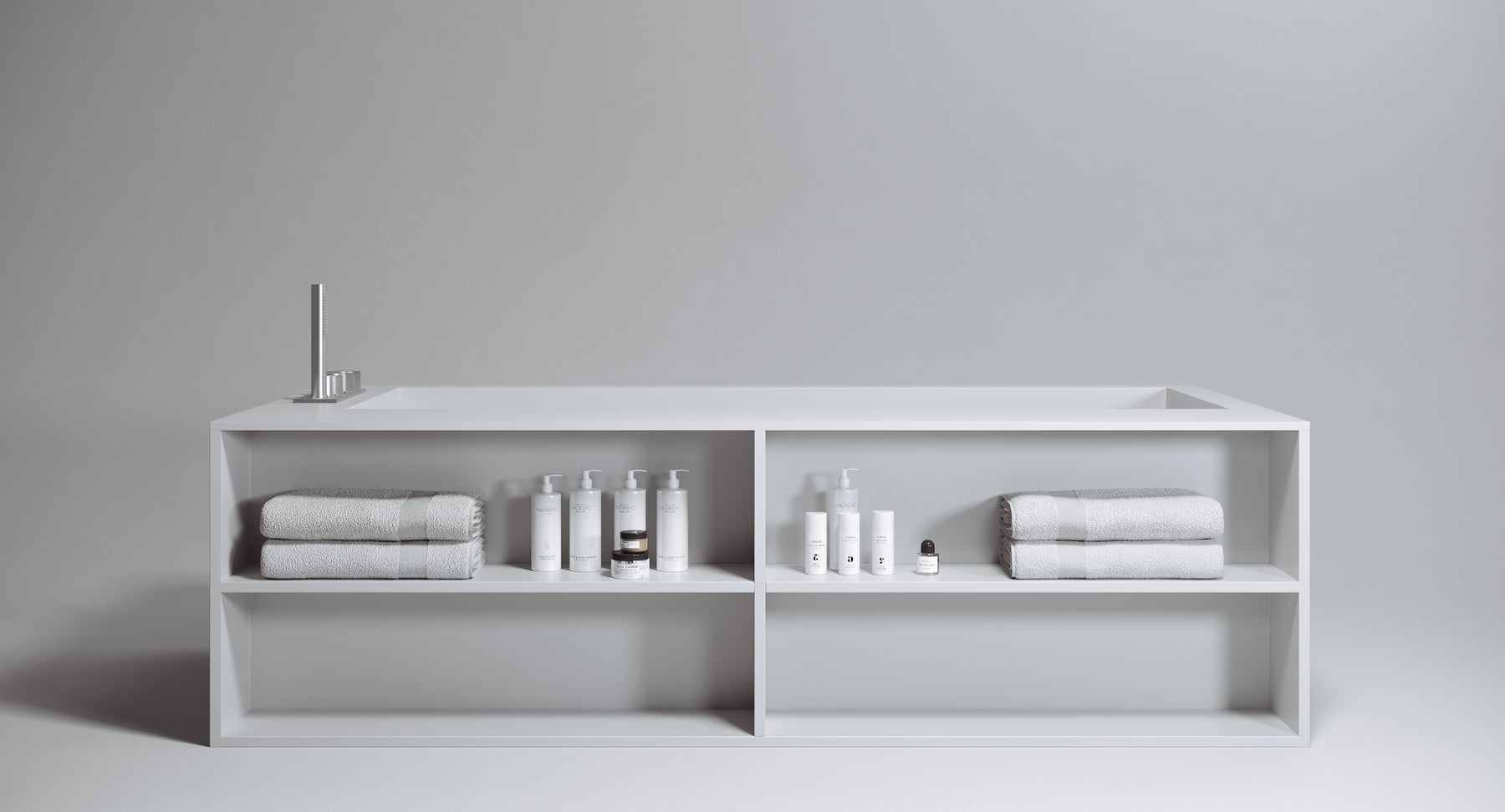 Absolute relaxation of body and mind thanks to an object that accepts the primary function of hosting, contain water, the primary resource for human life, and books, with which to satisfy thirst for knowledge. Large, rigorous in its pure shape with sharp corners. Rich with new meanings, space for accessories and surfaces. Biblio is made of Corian and can accommodate along two sides open compartments for books, objects and accessories. Useful spaces to organize and personalize your experience. Versatile because it be freestanding or embedded, democratic because it is approachable by either side. Customizable because the small built in library can take on a different character if covered with wood. There are many different options, please inquire for details.