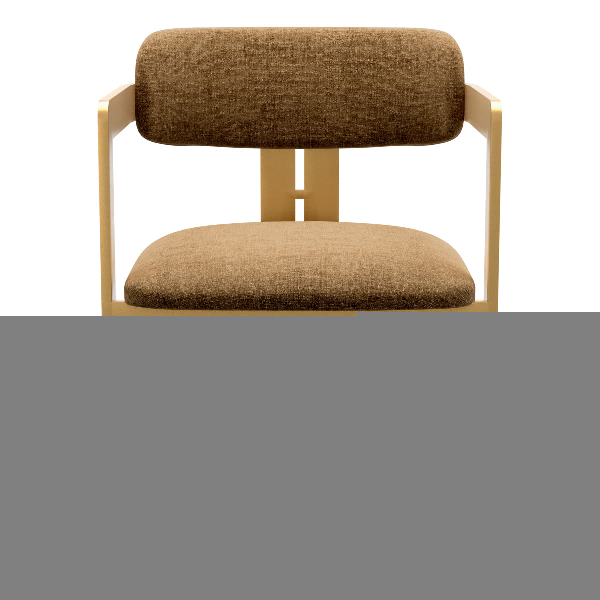 With its distinctive silhouette, the armrests of this chair merge effortlessly into the front legs, and the curved backrest is supported by two sleek rear legs. The seat is upholstered in hastings camel fabric, complemented by a brushed brass finish frame for a polished and stylish look. A statement piece that blends functionality with contemporary elegance.