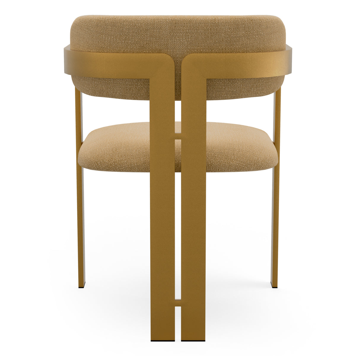 With its distinctive silhouette, the armrests of this chair merge effortlessly into the front legs, and the curved backrest is supported by two sleek rear legs. The seat is upholstered in Stratfort honey fabric, complemented by a brushed brass finish frame for a polished and stylish look. A statement piece that blends functionality with contemporary elegance.
